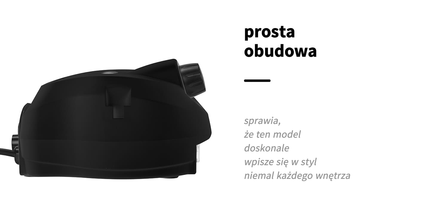 Klasyczna kolorystyka i minimalistyczne wykończenie sprawiają, że model ten doskonale wpisze się w styl niemal każdego wnętrza. Stosunkowo lekka budowa pozwala na łatwe przenoszenie, co umożliwia bezproblemowy transport. Urządzanie wykonane zostało z trwałych tworzyw sztucznych w odcieniach czerni, dzięki czemu jest łatwe do czyszczenia.