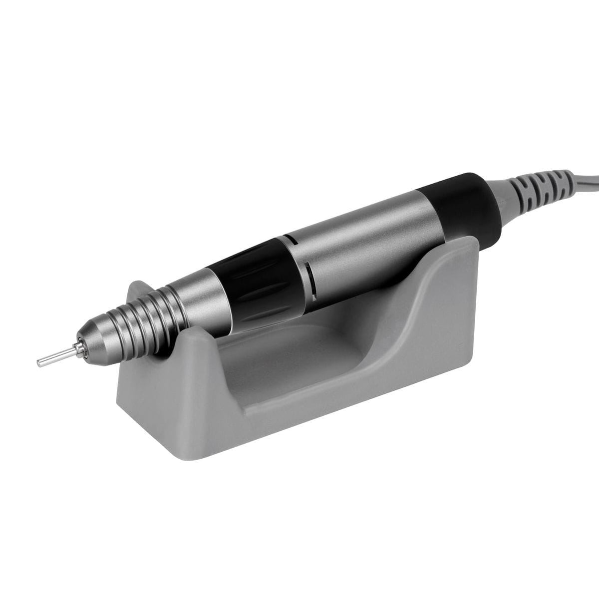 Czerwona dioda obok włącznika sygnalizuje stan pracy urządzenia. Prędkość obrotów głowicy frezarki można w łatwy sposób, płynnie dostosowywać przy użyciu specjalnego pokrętła w zakresie od 0 do 35 000 obrotów na minutę. Przełącznik z przodu urządzenia sprawnie zmienia kierunek obrotów, z kolei ten z tyłu pozwala na przestawianie sterowania – między ręcznym a nożnym. Do zestawu jest dołączony pedał, którego funkcja polega na włączaniu frezarki z uprzednio ustawionymi obrotami. Zapewnia to swobodną, komfortową pracę, dzięki możliwości sterowania urządzeniem bez zajmowania rąk. W trakcie pracy głowicę bezpiecznie można odłożyć na dedykowany silikonowy stojak lub odwiesić dzięki wygodnemu plastikowemu uchwytowi, który da się zamontować po obu stronach urządzenia.