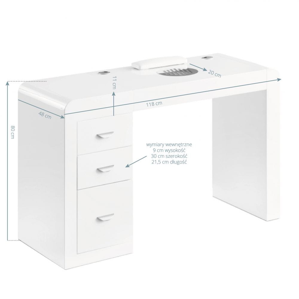 Biurko kosmetyczne z pochłaniaczem - bardzo funkcjonalny mebel do salonów kosmetycznych który łączy w sobie trzy funkcje: biurko, pochłaniacz pyłów i szafka z szufladami. Mebel idealnie komponujący się z wyposażeniem nowocześnie urządzonych pomieszczeń. Mebel został specjalnie zaprojektowany w taki sposób aby maksymalnie ułatwić pracę oraz zmniejszyć problem wystających kabli ( od lampek, frezarek, pochłaniaczy itp. ) :