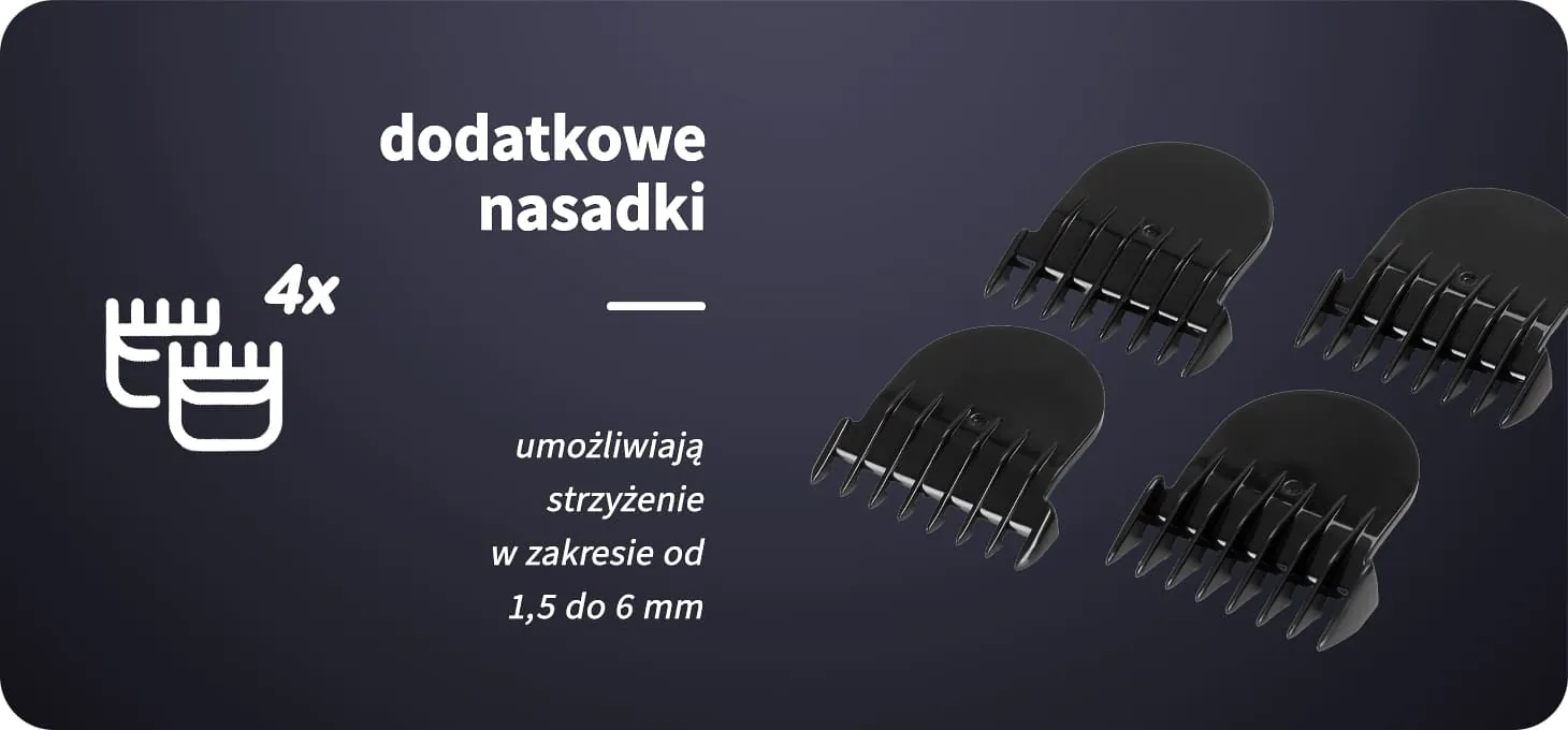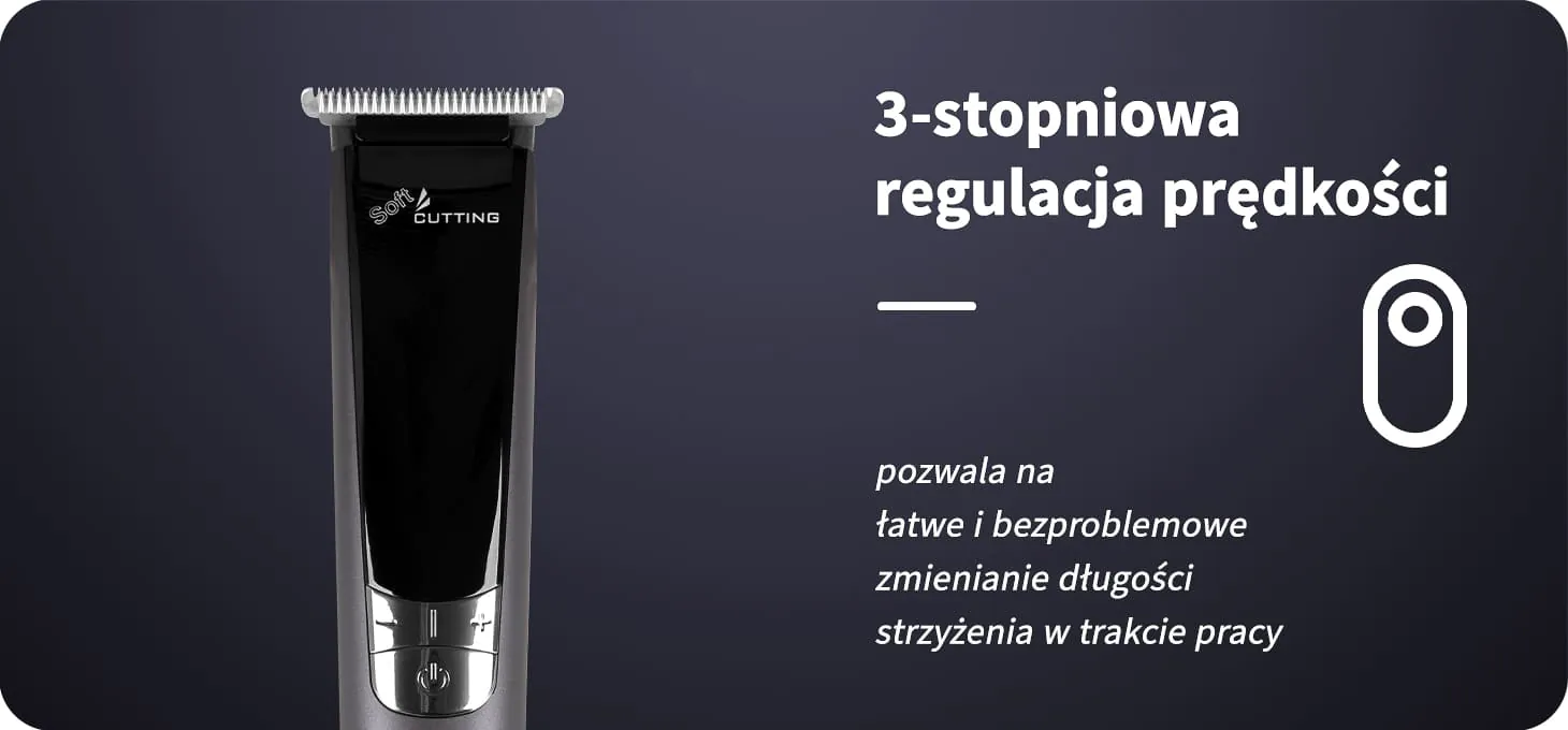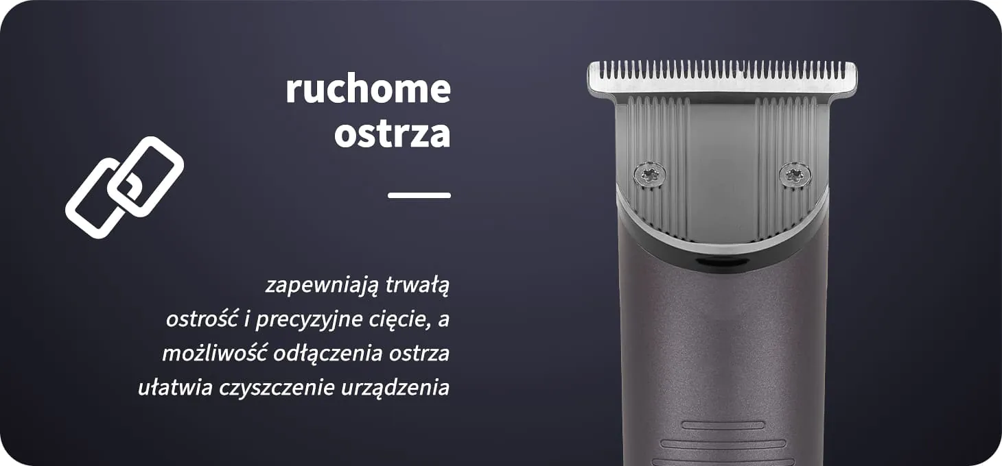 Ruchome ostrza ze stali nierdzewnej zapewniają trwałą ostrość i precyzyjne cięcie, a możliwość odłączenia ostrza ułatwia czyszczenie urządzenia. Trymer pozwala na regulację prędkości w trzech poziomach: 5000 RPM, 5500 RPM oraz 6000 RPM, co pozwala dostosować pracę urządzenia do różnych potrzeb użytkowników oraz rodzajów wykonywanych cięć. W zestawie znajdują się cztery nasadki grzebieniowe, umożliwia strzyżenie w zakresie od 1,5 mm do 6 mm, co sprawia, że trymer jest niezwykle wszechstronnym i precyzyjnym narzędziem. Dodatkowo, funkcja zabezpieczenia przed przeładowaniem i nadmiernym rozładowaniem baterii zwiększa bezpieczeństwo użytkowania.