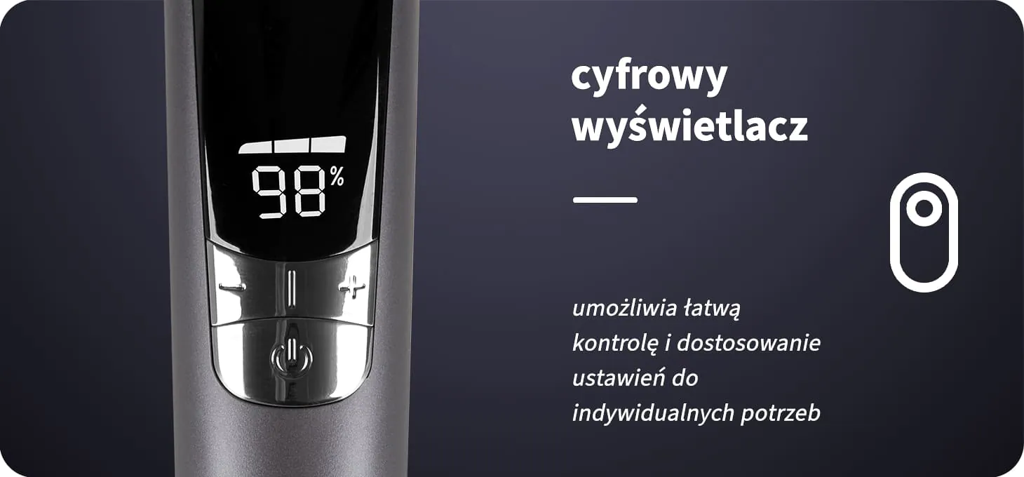 Maszynka o ergonomicznym kształcie została wykonana z matowego tworzywa sztucznego w odcieniach szarości, co gwarantuje nie tylko trwałość urządzenia, ale również łatwość jego czyszczenia. Doskonale leży w dłoni, zapewniając pełną kontrolę podczas strzyżenia. Stylowy panel dodaje elegancji, podkreślając jego nowoczesny charakter. Intuicyjnie rozmieszczone przyciski sprawiają, że korzystanie z trymera jest wyjątkowo komfortowe. To połączenie funkcjonalności i stylu sprawia, że trymer idealnie wpisuje się w gusta użytkowników, którzy cenią zarówno praktyczność, jak i elegancki wygląd.