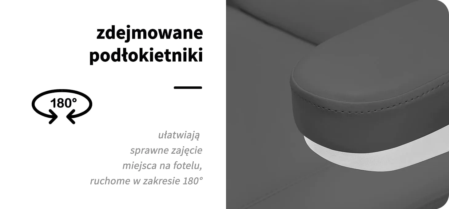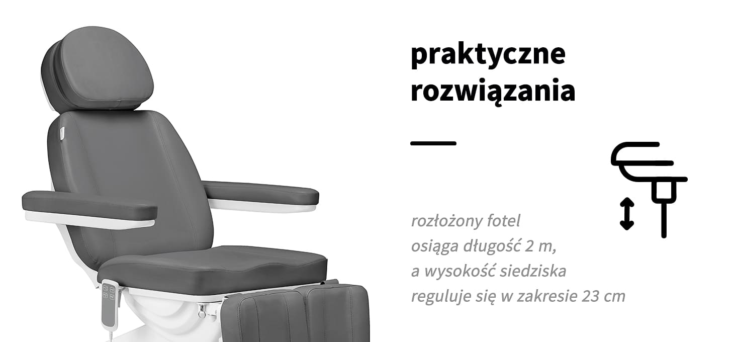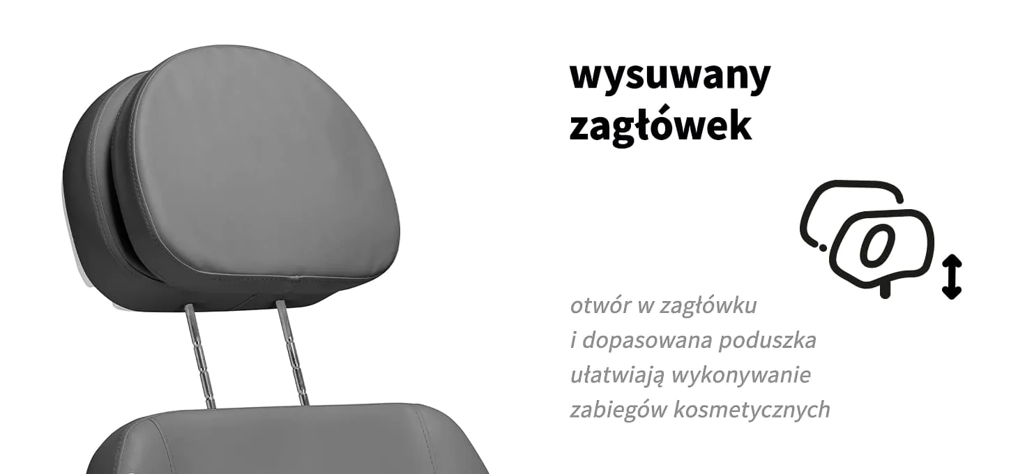 Wysuwany zagłówek pomaga dostosować sprzęt do potrzeb użytkowników o różnym wzroście, zapewniając stabilne wsparcie głowy w trakcie zabiegów. Możliwe jest również dostosowywanie wysunięcia podnóżka, co sprawdzi się zwłaszcza w trakcie zabiegów wykonywanych na wyższych osobach, zapewniając im lepsze podparcie. Podłokietniki są ruchome w zakresie 180º, dzięki czemu ułatwiają sprawne zajęcie miejsca na fotelu i zapewniają komfortowy dostęp osobie wykonującej zabieg. W razie potrzeby możliwy jest łatwy i szybki ich demontaż.