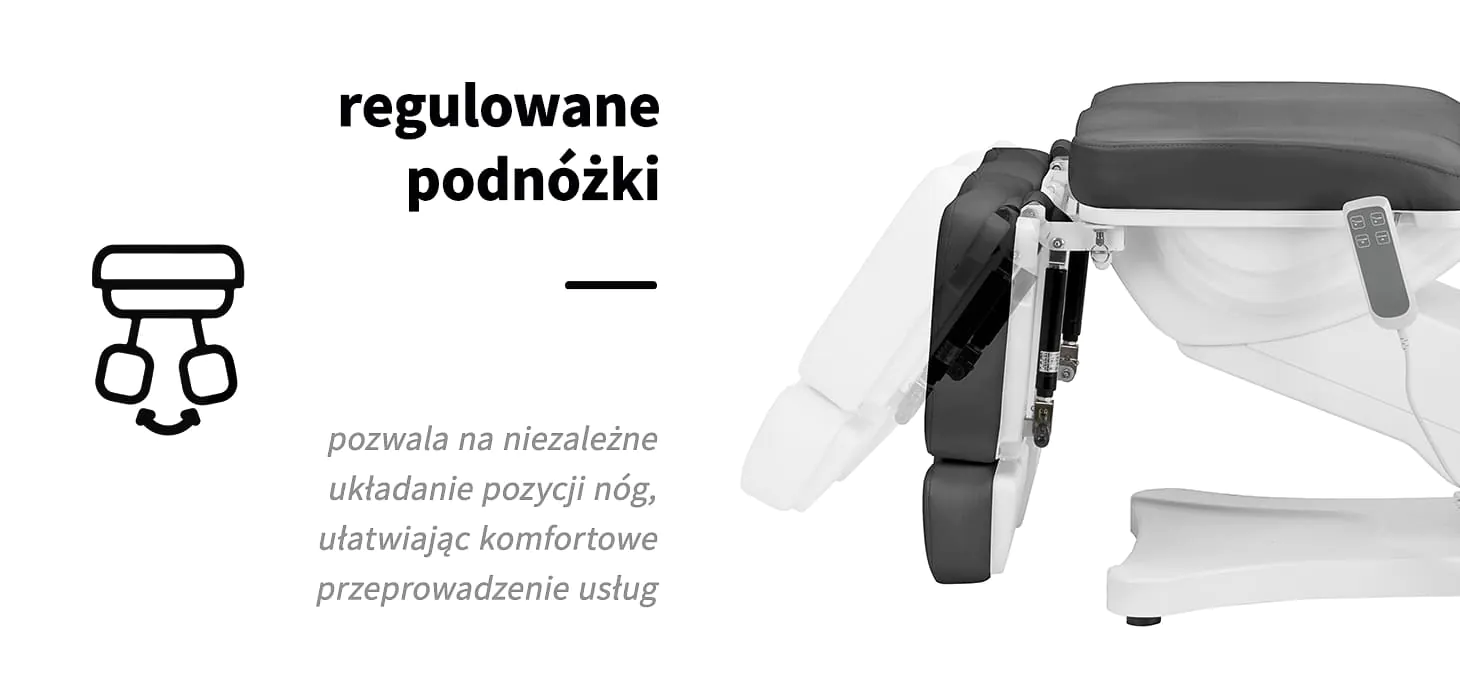 Fotel doskonale przystosowany jest do wykonywania zabiegów podologicznych – dzielony podnóżek ułatwia komfortowe przeprowadzenie usług, pozwalając na niezależne układanie pozycji nóg. Kąty, pod jakimi znajdują się jego części, regulowane są manualnie. Specjalnie zaprojektowany mechanizm pozwala na odchylanie podnóżków również na boki. Wysunięcie podnóżka również można dostosowywać, co zapewni lepsze podparcie wyższym użytkownikom. Wszystkie te cechy zapewniają wysoki komfort korzystania.