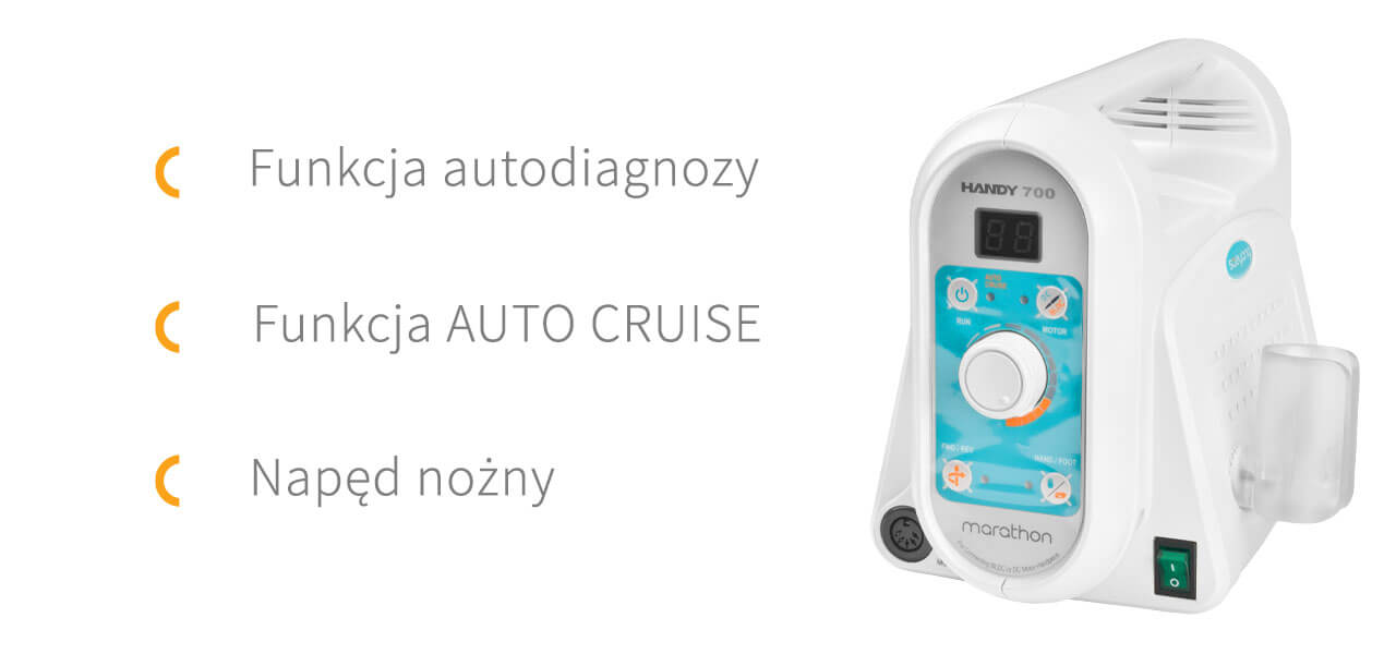 Frezarka protetyczna Handy 700 oferuje dużą moc 100W oraz cichą pracę. Zapewnia dużą prędkość do 50 tysięcy obrotów na minutę. Praca z tą frezarką jest wyjątkowo komfortowa dzięki temu, iż w mikrosilniku głowicy został zastosowany system redukcji hałasu, umniejszonego o 20% w porównaniu do konwencjonalnych modeli. Budowa bazy jest ergonomiczna, posiada praktyczny uchwyt do przenoszenia oraz pojemnik na głowicę.