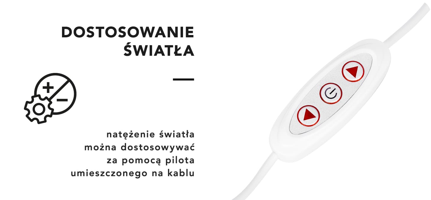 Natężenie można płynnie dostosowywać przy użyciu pilota umieszczonego na przewodzie zasilającym. Regulacja pozwala zadbać o dokładne oświetlenie miejsca zabiegowego w każdym momencie. Daje to ogromne możliwości dopasowania oświetlenia do indywidualnych potrzeb oraz wykonywanych w danym momencie usług. Tym samym poprawia efektywność i dokładność pracy, nie wzmagając przy tym przemęczenia wzroku.