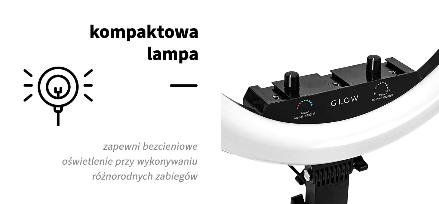 Lampa pierścieniowa Glow o średnicy 45 centymetrów to praktyczne urządzenie, które zapewnia doskonałe oświetlenie miejsca pracy w salonie kosmetycznym, fryzjerskim czy studiu tatuażu, a także sprawdzi się przy fotografii, nagrywaniu filmów oraz materiałów na media społecznościowe. Bezcieniowe oświetlenie usprawni wykonywanie różnorodnych zabiegów, a regulacja natężenia oraz barwy światła zapewnia większy komfort pracy. Możliwość wyboru koloru oświetlenia wpływa na urozmaicenie przygotowywanych materiałów i nadaje wyjątkowy klimat pomieszczeniom.