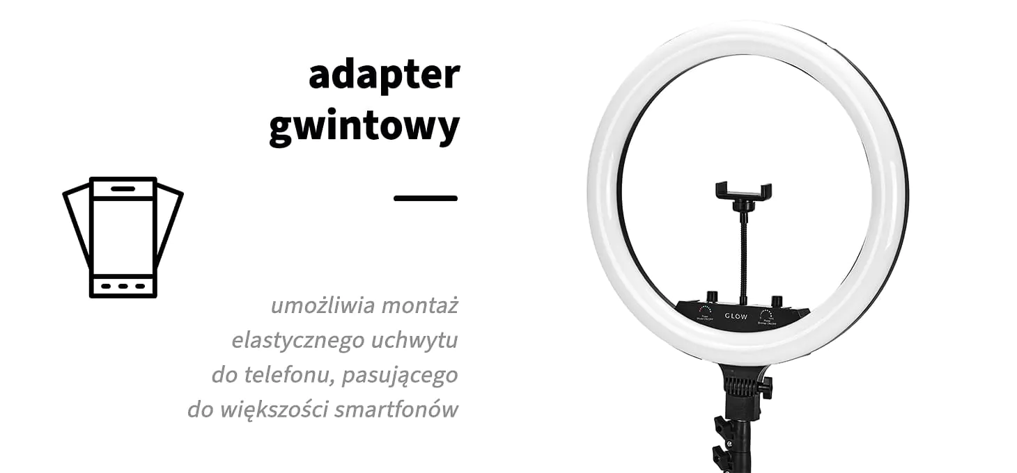 Wewnątrz pierścienia lampy znajdują się pokrętła, które umożliwiają płynną regulację temperatury barwowej w szerokim zakresie od 3000 do 6000 K, kontrolę natężenia światła w 12 poziomach oraz kolor światła RGB. Zdalny pilot pozwala na zmianę światła na odległość. Funkcjonalności te zapewniają dodatkową elastyczność podczas użytkowania lampy. Montaż na solidnym statywie gwarantuje komfort pracy w salonie kosmetycznym, studiu tatuażu czy w domu. Dodatkowo wewnątrz pierścienia lampy znajdują się aż trzy adaptery gwintowe umożliwiające montaż elastycznego uchwytu do telefonu, który jest zawarty w zestawie i – umożliwiając rozszerzenie zacisku do maksymalnie 15 cm – pasuje do większości smartfonów dostępnych na rynku. Umieszczone z tyłu pierścienia lampy wejście USB pozwala na podłączenie telefonu do ładowania w trakcie użytkowania.