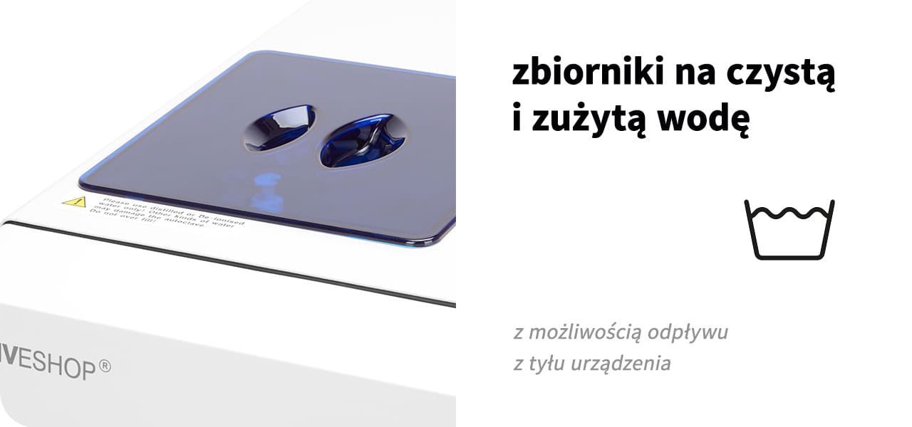 | Wbudowane zbiorniki na czystą i zużytą wodę | Zbiornik na czystą wodę jest przeznaczony na destylowaną lub dejonizowaną wodę, która posłuży do sterylizacji. Obecność zbiornika na zużytą wodę sprawia, że nie potrzebujemy pamiętać o zewnętrznym pojemniku. |
