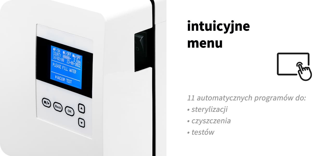 Autoklaw posiada 8 całkowicie automatycznych programów sterowanych dotykowym panelem z przyjaznym interfejsem w języku Polskim!