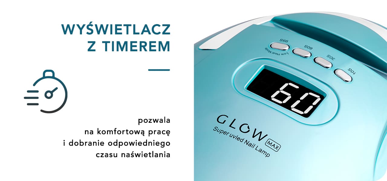 Lampa wyposażona jest w timer z zaprogramowanymi czterema czasami pracy: 10 s, 30 s, 60 s oraz 99 s (tzw. „Low Heat Mode”), co odliczane jest na cyfrowym wyświetlaczu. Dodatkowo jeśli żaden tryb nie zostanie wybrany, wbudowany sensor ruchu automatycznie uruchomi lampę po włożeniu pod nią palców dłoni bądź stopy, przyjmując maksymalny czas naświetlania 120 s. Na wyświetlaczu widoczny będzie wtedy czas utwardzania. Pozwala to na dogodne dobranie długości naświetlania do wykonywanej w danym momencie stylizacji oraz używanych produktów.