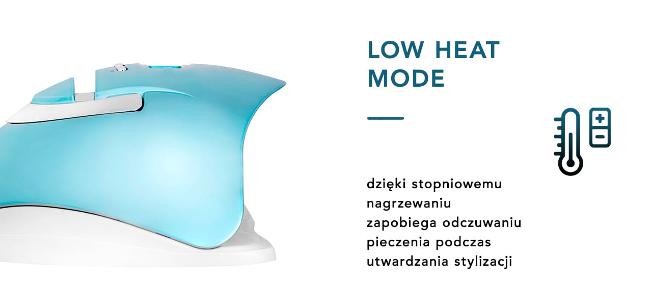 Koniec z nieprzyjemnym pieczeniem podczas utrwalania stylizacji! Wspomniany już system „Low Heat Mode” sprawia, że w trakcie utwardzania produktów na paznokciach urządzenie stopniowo zwiększa swoją moc, tym samym wolniej się nagrzewając. Zapobiega to odczuwaniu gorąca w trakcie naświetlania. Jest to funkcja niezastąpiona zwłaszcza w trakcie utwardzania żeli, co często powoduje dyskomfort przy użyciu innych lamp dostępnych na rynku.