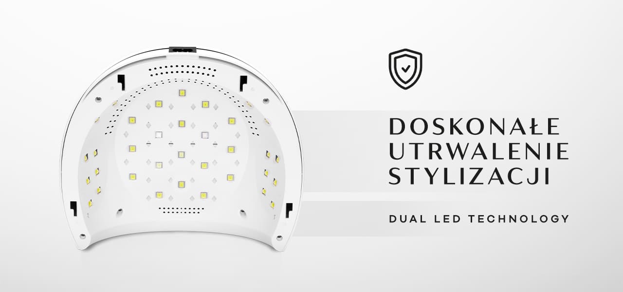 Idealne utwardzenie żeli oraz lakierów hybrydowych zapewniają 42 odpowiednio rozmieszczone diody LED – bez tzw. martwej strefy. Zamknięty kształt, czyli tzw. budka, na który postawiono przy projekcie tego modelu, pozwala na dokładniejsze i szybsze utrwalanie stylizacji paznokci. Zastosowana technologia Dual Led sprawia, że diody emitują światło o dwóch długościach fali, tym samym nie męcząc oczu i zapewniając urządzeniu szerokie spektrum działania. Wybrane rozwiązania ułatwiają prawidłowe utwardzenie nawet najbardziej wymagających produktów, pozwalając na dotarcie nawet do trudniej dostępnych miejsc na płytce paznokcia.