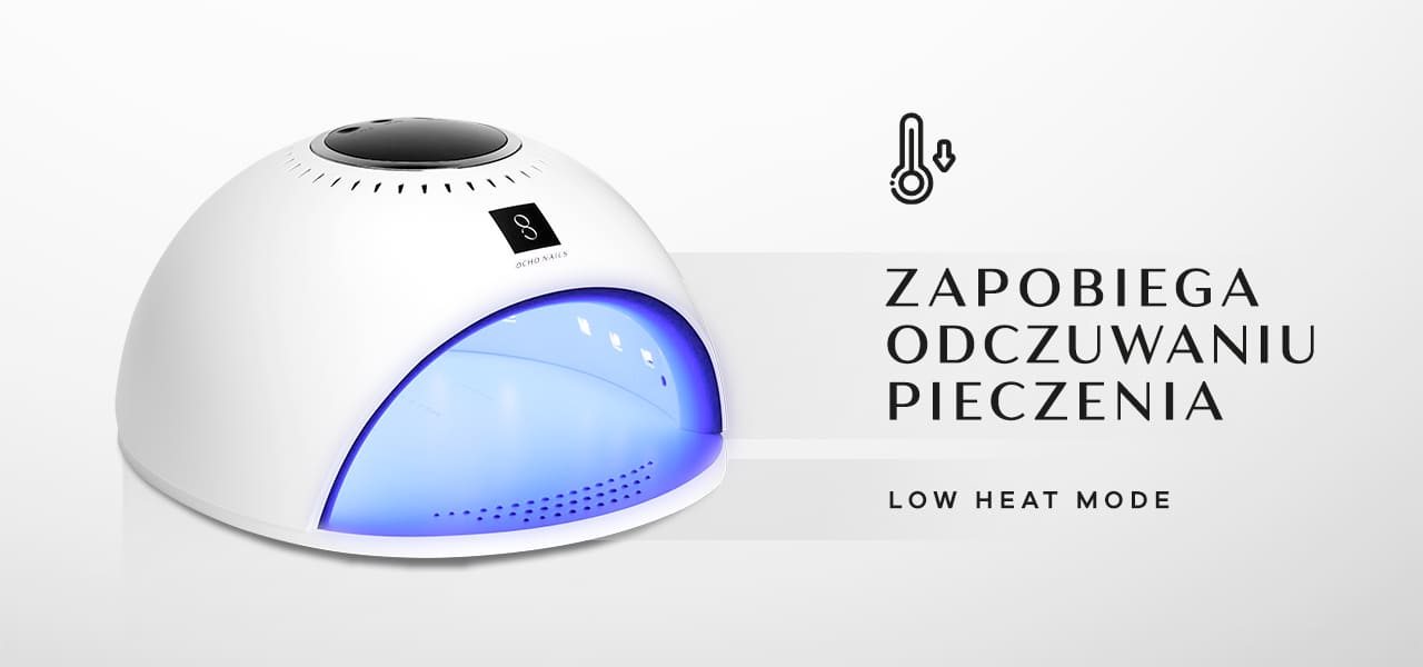 Lampa wyposażona jest w timer z trzema zaprogramowanymi czasami pracy: 30 s, 60 s oraz 120 s (tzw. „Low Heat Mode”), które są odliczane na wyraźnym cyfrowym wyświetlaczu. Wbudowany sensor ruchu automatycznie uruchamia lampę po włożeniu pod nią palców dłoni bądź stopy, przyjmując maksymalny czas naświetlania 120 s. Funkcja ta działa, gdy nie zostanie wybrany żaden tryb, a na wyświetlaczu widoczny będzie upływający czas utwardzania. Pozwala to na swobodne dobieranie długości naświetlania do wykonywanej w danym momencie stylizacji. Dodatkowo po wybraniu wspomnianego już systemu „Low Heat Mode” w trakcie utwardzania stylizacji lampa wolniej się nagrzewa, stopniowo zwiększając swoją moc. Zapobiega to odczuwaniu pieczenia czy gorąca w trakcie naświetlania. Jest to funkcja niezastąpiona zwłaszcza w trakcie utwardzania żeli, co często powoduje dyskomfort przy użyciu innych lamp dostępnych na rynku.