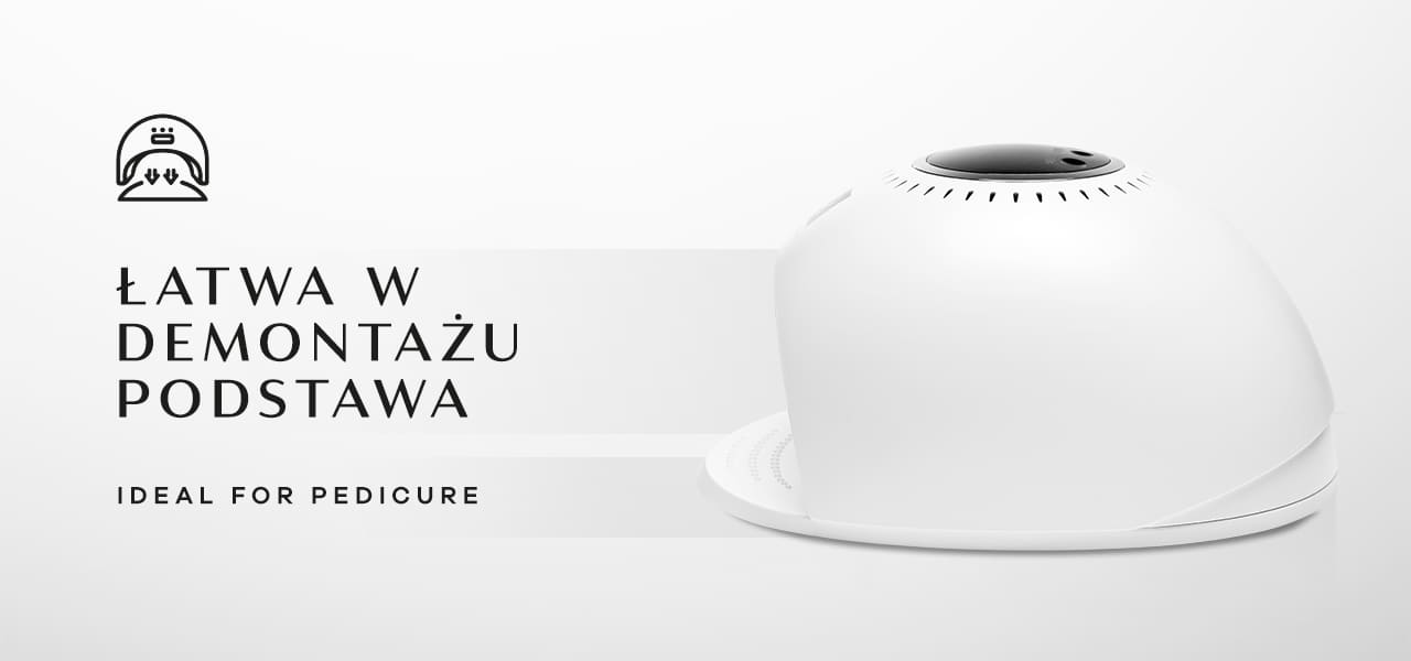 Skrupulatnie dobrane funkcje, matowe wykończenie oraz klasyczne białe odcienie obudowy sprawiają, że lampa jest gustownym, a zarazem niezwykle praktycznym elementem wyposażenia salonu. Odpowiednie wymiary pozwalają na swobodne ułożenie całej dłoni czy stopy pod lampą w trakcie wykonywania zabiegu. Zapewnia to sprawne, równomierne utwardzanie stylizacji oraz zmniejsza ryzyko wystąpienia alergii. Posiada łatwe w demontażu zdejmowane dno, co wyraźnie ułatwia układanie pod nią stopy w przypadku zabiegów pedicure czy podologicznych. Opcja ta sprawdzi się również doskonale w trakcie czyszczenia czy dezynfekcji urządzenia.