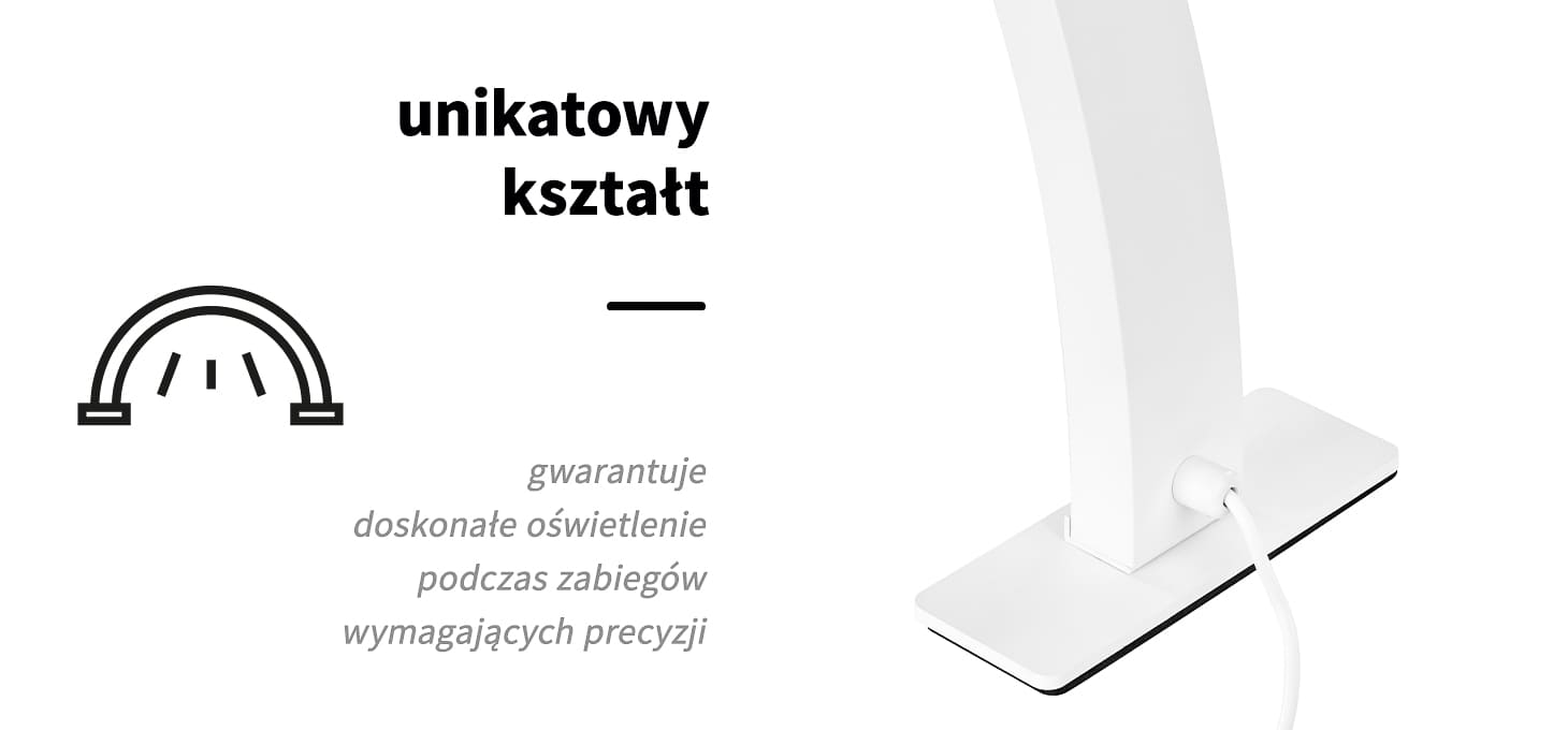 Charakterystyczny kształt głowicy lampy to ciekawy design, który jednocześnie gwarantuje wysoką funkcjonalność. Specyficznie wygięty profil wypełniony 300 diodami LED zapewnia bezcieniowe doświetlenie obszaru zabiegowego, dzięki czemu zapewnia wysoki komfort w trakcie wykonywania usług. Doskonale sprawdzi się również podczas robienia zdjęć efektów, wyraźnie je eksponując. Mleczna, półprzezroczysta powierzchnia panelu dobrze rozprasza światło, dzięki czemu lampa nie razi w oczy. Odpowiednie parametry i możliwość dostosowywania barwy światła zapewniają doskonałe odwzorowanie widzianych barw, a co za tym idzie – lampa nie męczy oczu, nawet podczas długotrwałej pracy.