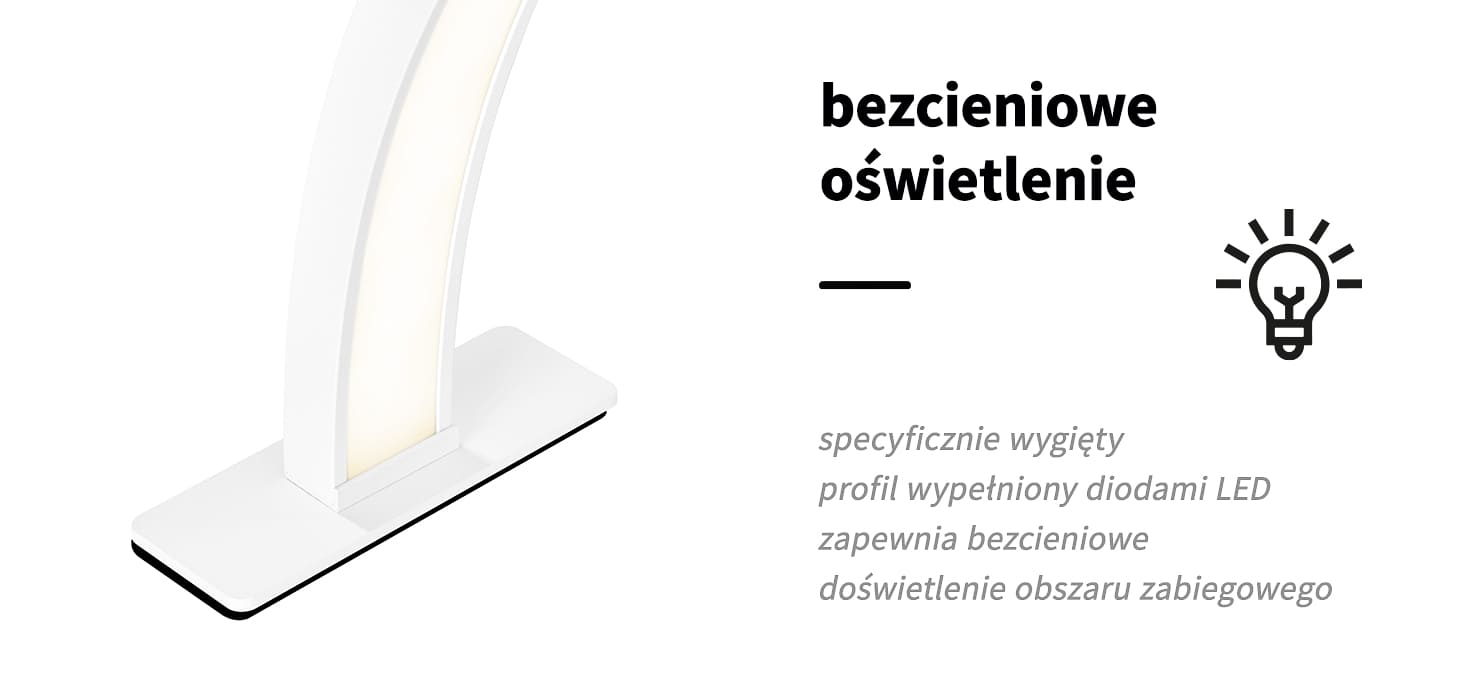 Unikatowa forma oraz minimalistyczny design w klasycznym odcieniu bieli sprawiają, że lampa Glow Arche III robi wrażenie w każdym wnętrzu. Charakterystyczny wygląd i łukowaty kształt nadają jej niekonwencjonalnego charakteru, a możliwość regulacji temperatury barwowej uefektywnia pracę. Elementy podstawy pokryte antypoślizgową powierzchnią pozwalają na dogodne, stabilne ustawienie oświetlenia przy stanowisku pracy. Zastosowane tworzywa sztuczne oraz metalowe elementy sprawiają, że urządzenie jest trwałe oraz łatwe do utrzymania w czystości.