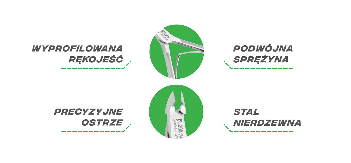 Podwójna sprężyna łączy ramiona cążek, zapewniając doskonałe wyczucie oraz precyzję cięcia. Staranne jej wykonanie pozwala na komfortową, cichą i płynną pracę. Sposób wyprofilowania oraz wielkość ramion sprawiają, że cążki stabilnie leżą w dłoni, gwarantując pełną wygodę korzystania. Matowe wykończenie sprawia, że prezentują się elegancko, a powierzchnia poddana pasywacji zwiększa ich odporność oraz ułatwia utrzymanie w czystości. Czyni je to idealnym narzędziem zarówno dla profesjonalistów, jak i miłośników pielęgnacji paznokci w warunkach domowych.