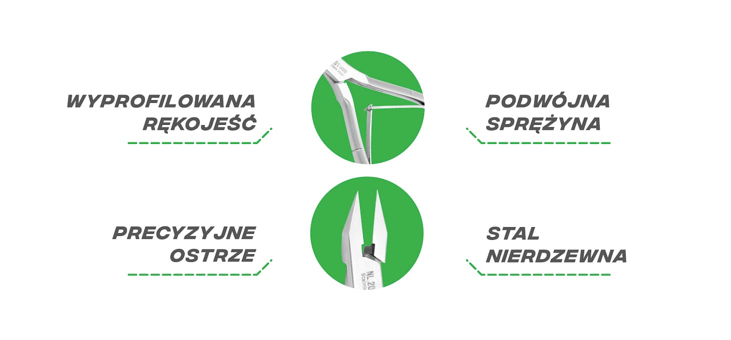 Praktyczna podwójna sprężyna łącząca ramiona zapewnia doskonałe wyczucie, stabilność oraz precyzję cięcia. Staranne jej wykonanie pozwala na komfortową, cichą i płynną pracę. Sposób wyprofilowania oraz wielkość ramion sprawiają, że cęgi świetnie leżą w dłoni, gwarantując wygodę korzystania. Matowe wykończenie sprawia, że prezentują się elegancko, a powierzchnia poddana pasywacji zwiększa ich odporność oraz ułatwia utrzymanie w czystości. Czyni je to idealnym narzędziem zarówno dla profesjonalistów, jak i miłośników dbania o paznokcie w warunkach domowych.