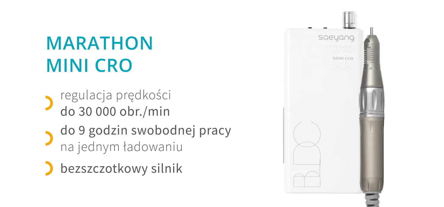 Kompaktowa frezarka akumulatorowa Saeyang Marathon Mini Cro z bezszczotkowym silnikiem to praktyczne urządzenie, które sprawdzi się zarówno w pracy w salonie, jak i w usługach mobilnych. Ułatwia precyzyjne opracowywanie paznokci oraz skórek, tworząc idealną bazę do dalszych stylizacji. Dzięki ergonomicznemu kształtowi i lekkiej konstrukcji praca staje się komfortowa i mniej męcząca, a wydajny akumulator pozwala na nieprzerwaną pracę nawet do 9 godzin na jednym ładowaniu, zapewniając pełną swobodę w wykonywaniu zabiegów.