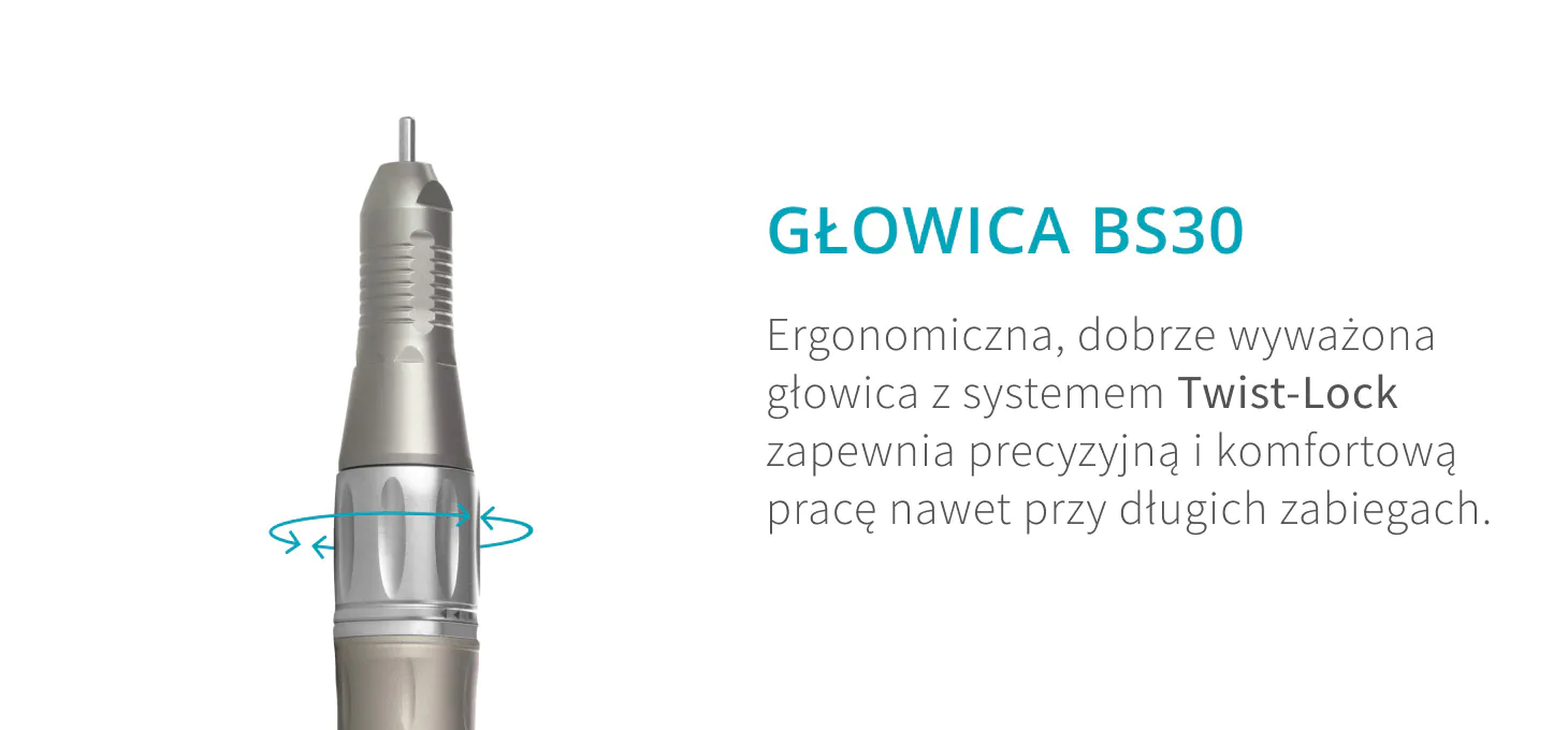 Smukła głowica BS30 dobrze układa się w dłoni i pozwala na komfortową, precyzyjną pracę. Dzięki odpowiedniemu wyważeniu oraz znacznemu ograniczeniu drgań użytkowanie jej nie męczy nadmiernie ręki, umożliwiając nawet wielogodzinne wykonywanie zabiegów. Wyposażona jest w prosty w obsłudze system Twist-Lock, który pozwala na szybką i łatwą wymianę frezów. Praca z urządzeniem jest dzięki temu wyjątkowo łatwa oraz intuicyjna, co zostanie docenione również przez bardziej wymagających użytkowników.