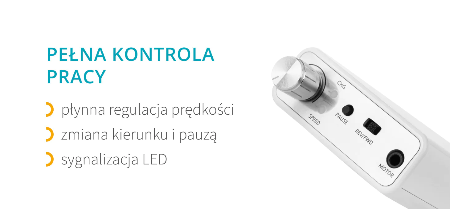 Frezarka umożliwia płynną regulację prędkości głowicy do 30 000 obrotów na minutę, a wbudowany system click informuje charakterystycznym kliknięciem o prawidłowym ustawieniu pokrętła, chroniąc silnik przed przeciążeniem. Wskaźnik LED zmienia kolor w zależności od ustawionej prędkości, ułatwiając kontrolę pracy, a dodatkowa dioda informuje o stanie naładowania lub ładowania baterii. Funkcje pauzy i zmiany kierunku obrotów pozwalają bezpiecznie i wygodnie dostosować urządzenie do różnych zabiegów. Wbudowane zabezpieczenie przed przeciążeniem zwiększa ochronę silnika i bezpieczeństwo pracy, zapewniając pełną kontrolę nad frezarką w każdej sytuacji.