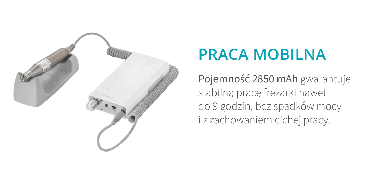 Frezarka pracuje cicho, zapewniając komfort zarówno stylistce, jak i klientom. Wydajny akumulator o pojemności 2850 mAh pozwala na nieprzerwaną pracę nawet do 9 godzin. Urządzenie zostało zaprojektowane z myślą o ergonomii – intuicyjne rozmieszczenie przycisków i prosta obsługa sprawiają, że każdy zabieg przebiega płynnie i wygodnie.