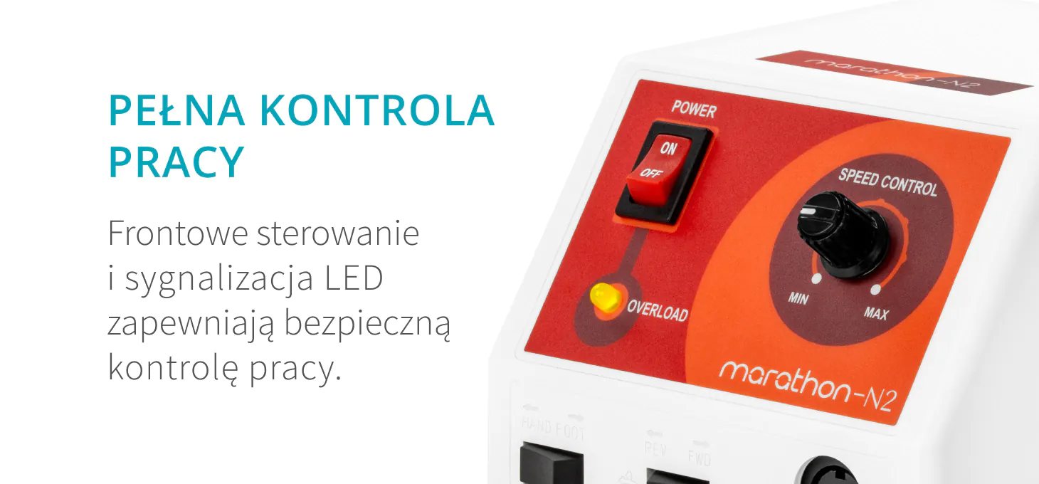 Bezstopniowa regulacja prędkości do 30 000 obrotów na minutę zapewnia elastyczność pracy i komfort wykonywania różnorodnych zabiegów. Możliwość zmiany obrotów i sterowania – przełącznik z przodu urządzenia. Płynna zmiana kierunku obrotów z wbudowaną pauzą zapewnia bezpieczne przejście między pracą w obu kierunkach. Zabezpieczenie przed przeciążeniem z ostrzegawczym sygnałem LED chroni silnik przed przegrzaniem, co zapewnia większe bezpieczeństwo pracy oraz chroni przed uszkodzeniem urządzenia.