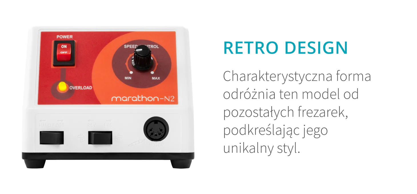 Frezarka Saeyang Marathon N2 Retro o niewielkich gabarytach łączy wysoką funkcjonalność z dopracowaną estetyką. Obudowa utrzymana w stylistyce retro, w odcieniach bieli i pomarańczu, nadaje urządzeniu charakterystyczny i przyciągający wzrok wygląd. Dodatkowo frezarka została wyposażona w gumowane stopki, które zapewniają stabilne ustawienie oraz chronią blat przed ewentualnymi uszkodzeniami. Frezarka doskonale sprawdza się w codziennej pracy, oferując komfort użytkowania przy każdym zabiegu manicure i pedicure.