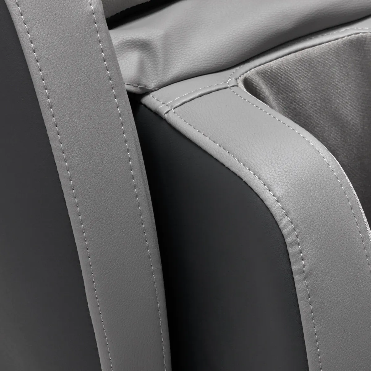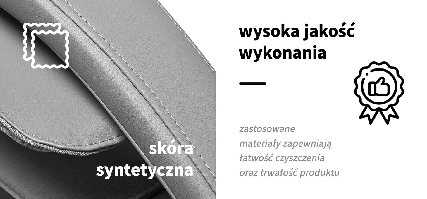 Wygodne wnętrze fotela pokryte jest przyjemną w dotyku imitacją skóry w odcieniach szarości. Zastosowanie takiego materiału sprawia, że jest wysoce odporny na wilgoć oraz łatwy w czyszczeniu. Imitacja skóry w odcieniach szarości na zewnętrznych częściach fotela sprawia, że produkt prezentuje się niezwykle oryginalnie, a zarazem elegancko. Starannie wykonane obszycia nadają mu stylowy wygląd, a solidna konstrukcja gwarantuje długie użytkowanie. Kompaktowy model o estetycznym wykończeniu i klasycznej kolorystyce świetnie wpasuje się w każde wnętrze. Fotel masujący Sakura Classic 305 to doskonały sposób na relaks w dowolnej chwili, zwłaszcza po wyczerpującym dniu lub ciężkim treningu.