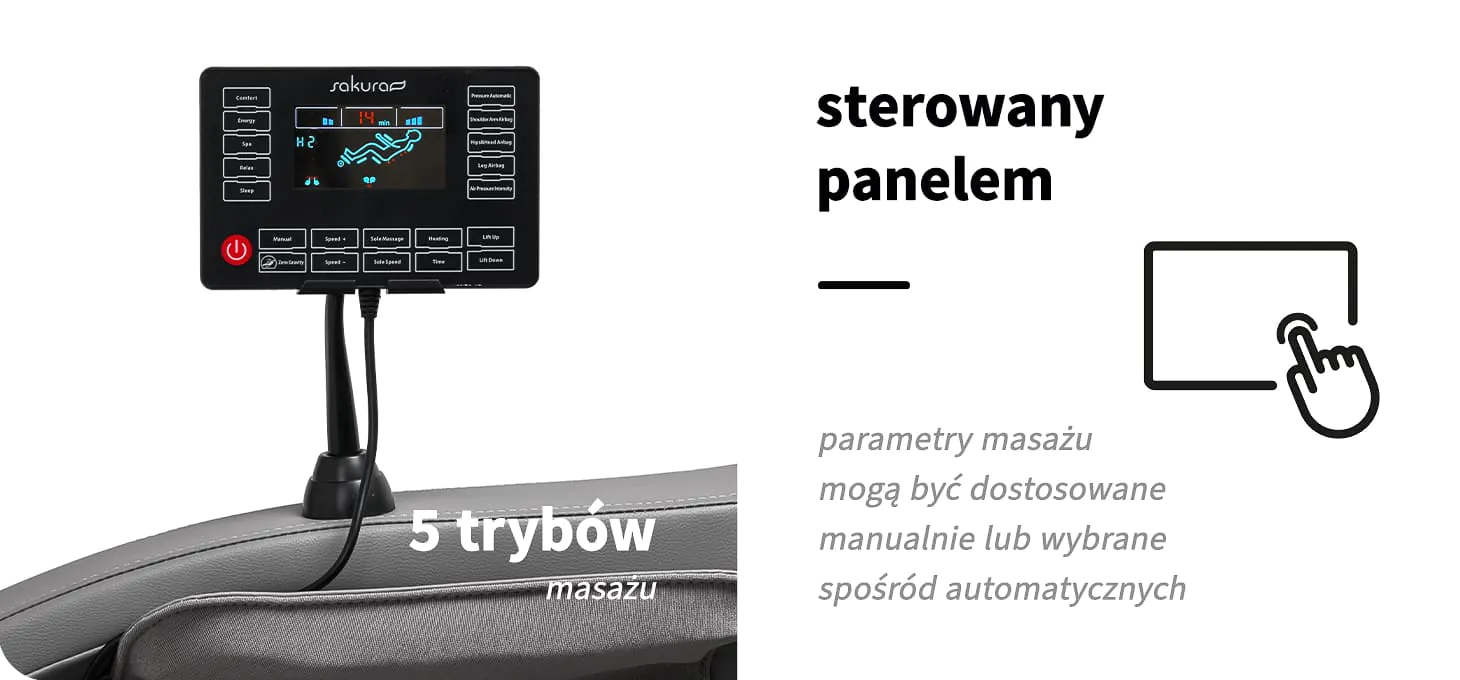 Dzięki przejrzystemu panelowi sterowania – który możemy umieścić na uchwycie zamontowanym na prawym podłokietniku bądź trzymać w dłoniach – korzystanie z fotela jest proste i przyjemne. Na wyrazistym ekranie LCD można śledzić pracę urządzenia. Wyraźnie wyświetlane są obszary ciała, na których w danym momencie przeprowadzany jest masaż, jego intensywność, czas zabiegu oraz wybrany program. Panel pozwala na swobodne dostosowywanie ustawień fotela oraz funkcji masażu, a także ustalenie czasu trwania zabiegu, który może trwać 5, 10, 15, 20, 25 lub 30 minut.