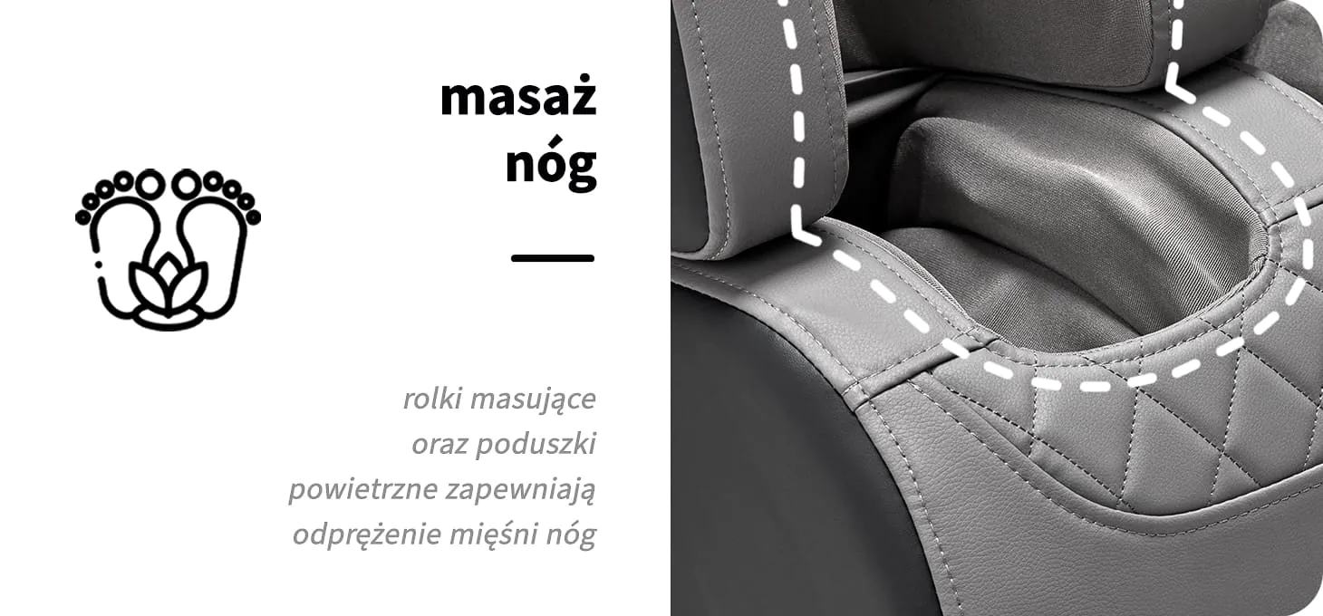 Mechanizm masujący dokładnie i przyjemnie rozmasowuje mięśnie na kilka sposobów. Osiem głowic masujących zapewnia efektywny masaż pleców, imitując pracę ludzkich rąk. Ich ruchy wykonują masaż ugniatający oraz uciskający, dzięki czemu poprawiają ogólną sprawność organizmu i eliminują bóle. Po każdej sesji masażu na fotelu zauważalna jest wyraźna redukcja napięcia mięśni, a ciało staje się przyjemnie zrelaksowane oraz pobudzone. Wbudowany masażer rolkowy stóp stosuje metody akupresury, przez co skutecznie rozluźnia mięśnie, niweluje zmęczenie oraz wpływa pozytywnie na ogólne samopoczucie.