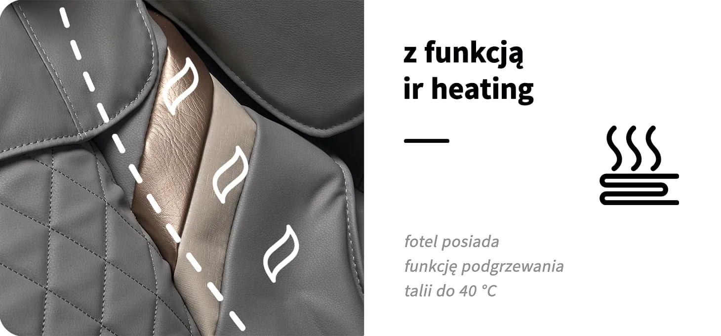 Fotel wyposażony jest w opcję podgrzewania pleców. Funkcja ta skutecznie wspiera i uprzyjemnia rozmasowanie napięć, zwiększając komfort płynący z masażu. Model ten posiada regulację wysunięcia podnóżka, dzięki czemu każdy użytkownik – niezależnie od wzrostu – będzie mógł znaleźć wygodną pozycję do masażu.