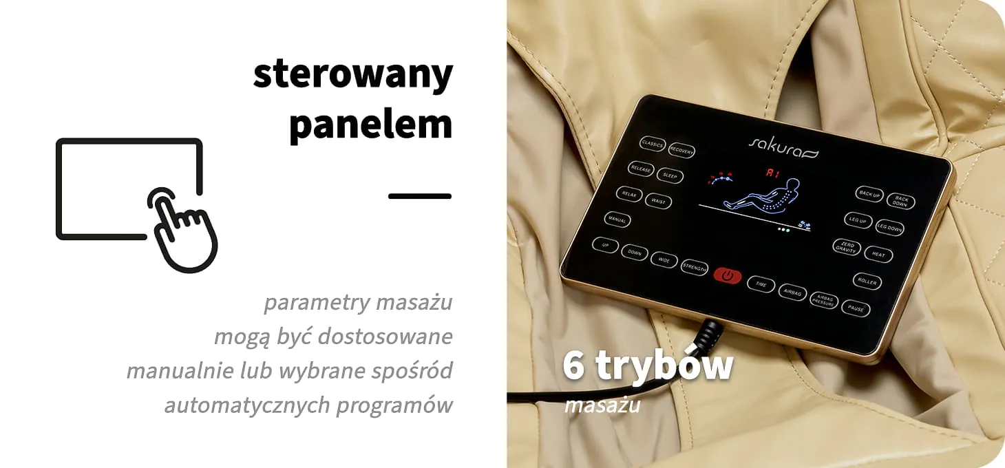 Przejrzysty panel sterowania – który możemy umieścić na uchwycie zamontowanym na prawym podłokietniku bądź trzymać w dłoniach – sprawia, że korzystanie z fotela jest proste i przyjemne. Na czytelnym ekranie można śledzić aktualny przebieg pracy urządzenia. Wyświetlane są wyraźnie konkretne obszary ciała, na których w danym momencie wykonywany jest masaż, jego intensywność, czas trwania zabiegu oraz wybrany program. Panel pozwala na swobodne dostosowywanie ustawień fotela oraz funkcji masażu, a także ustalenie czasu trwania zabiegu, który może trwać 5, 10, 15, 20, 25 lub 30 minut. W łatwy sposób można dostosować również siłę masażu głowicami oraz poduszkami powietrznymi w 5 poziomach.