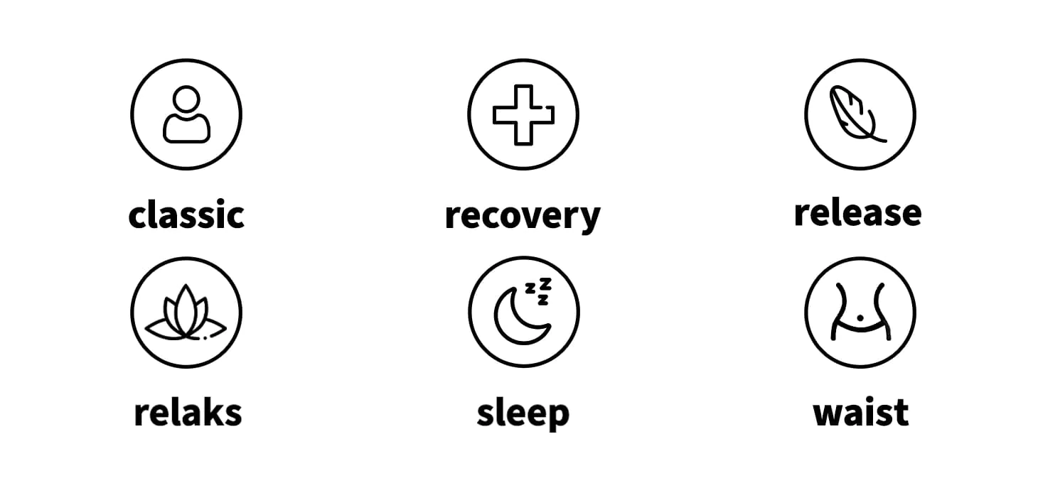 Fotel ma możliwość dostosowania parametrów pod indywidualne potrzeby (Manual) oraz 6 zaprogramowanych trybów automatycznych o różnorodnych efektach. Zostały one zaprojektowane w taki sposób, by odpowiadały na wszelkie możliwe potrzeby użytkowników. W starannie dobranych sekwencjach używane są poszczególne funkcje fotela – ruchy głowic masujących, aktywność poduszek powietrznych, tryb ZERO GRAVITY czy podgrzewanie. W zależności od oczekiwanych efektów wystarczy wybrać na panelu sterowania odpowiedni tryb:
