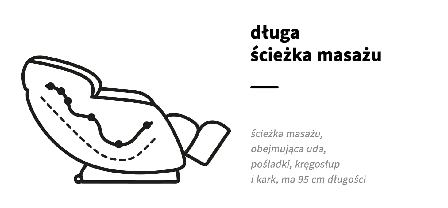 Długa ścieżka masażu głowicami mierzy aż 95 cm, dzięki czemu obejmuje uda, pośladki, biodra, kręgosłup, a także kark. Mechanizm masujący dokładnie i przyjemnie rozmasowuje mięśnie na kilka sposobów. Cztery silikonowe głowice masujące nowej generacji, poruszając się ze zmienną prędkością w górę i w dół oraz na boki, zapewniają efektywny masaż pleców, imitując pracę ludzkich rąk. Ich ruchy wykonują masaż stukający, ugniatający, uciskający oraz shiatsu, dzięki czemu poprawiają ogólną sprawność organizmu i eliminują bóle. Po każdej sesji masażu na fotelu zauważalna jest wyraźna redukcja napięcia mięśni, a ciało staje się przyjemnie zrelaksowane oraz pobudzone. Wbudowany masażer rolkowy stóp stosuje metody akupresury, a jego praca skutecznie rozluźnia mięśnie, niweluje zmęczenie oraz wpływa pozytywnie na ogólne samopoczucie.