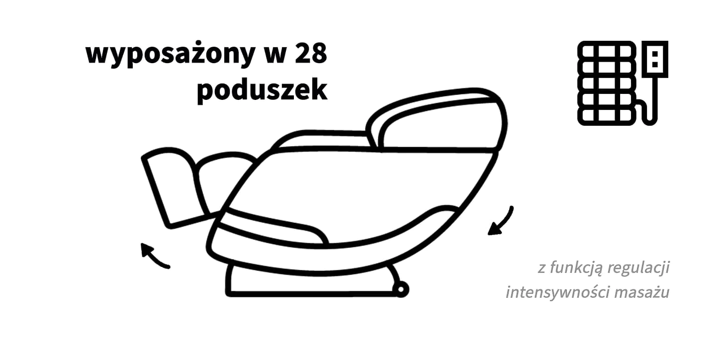 Doskonałym uzupełnieniem masażu mechanicznego głowicami jest masaż uciskowy z wykorzystaniem rozmieszczonych w różnych strefach fotela 28 poduszek powietrznych, zapewniając drenaż limfatyczny. Pulsujący ruch poduszek powietrznych w obszarze stóp, łydek, pośladków, rąk oraz barków reguluje przepływ limfy, ułatwia proces detoksykacji i poprawia krążenie krwi. Tym samym obniża się ciśnienie krwi, mięśnie zostają lepiej dotlenione, a organizm łatwiej pozbywa się toksyn. Zabieg taki eliminuje napięcia i zapewnia przyjemną ulgę na resztę dnia. Aktywność poduszek można dostosowywać na panelu sterowania.