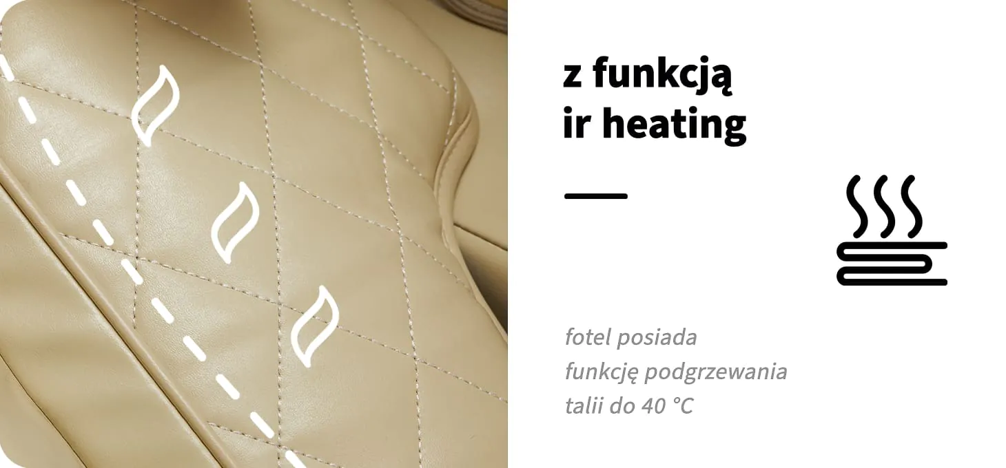 Fotel wyposażony jest w opcję podgrzewania pleców. Funkcja ta skutecznie wspiera i uprzyjemnia rozmasowanie napięć, zwiększając komfort płynący z masażu. Model posiada mechaniczną regulację wysunięcia podnóżka, dzięki czemu każdy użytkownik – niezależnie od wzrostu – będzie mógł znaleźć dla siebie wygodną pozycję do masażu.