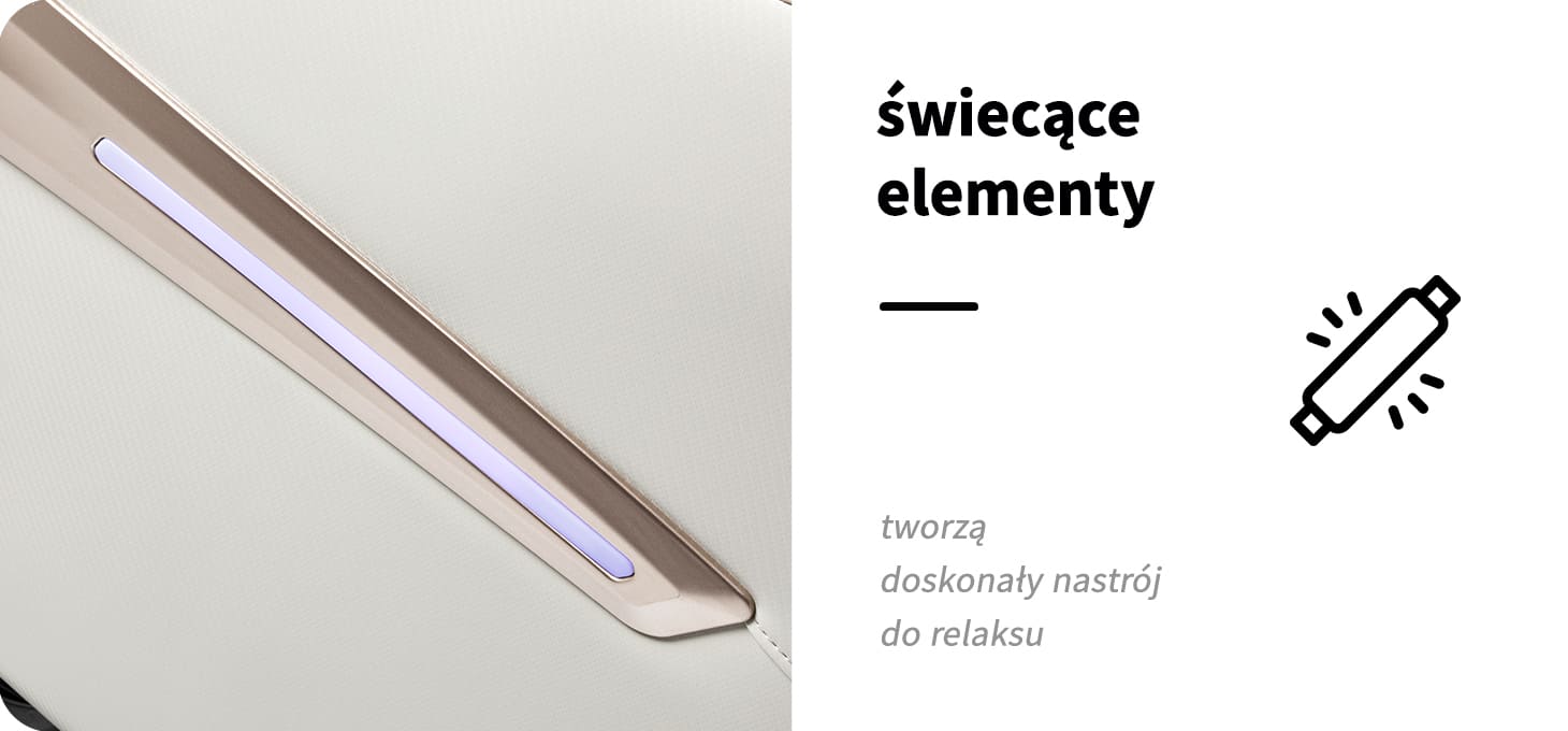 Subtelne podświetlenie bocznych paneli podkreśla nowoczesny design urządzenia i dodaje mu elegancji. Delikatna barwa światła sprzyja wyciszeniu, wspiera relaks i tworzy przyjemną atmosferę. To stylowy akcent dekoracyjny, który przyciąga uwagę i nadaje wnętrzu wyjątkowego charakteru.