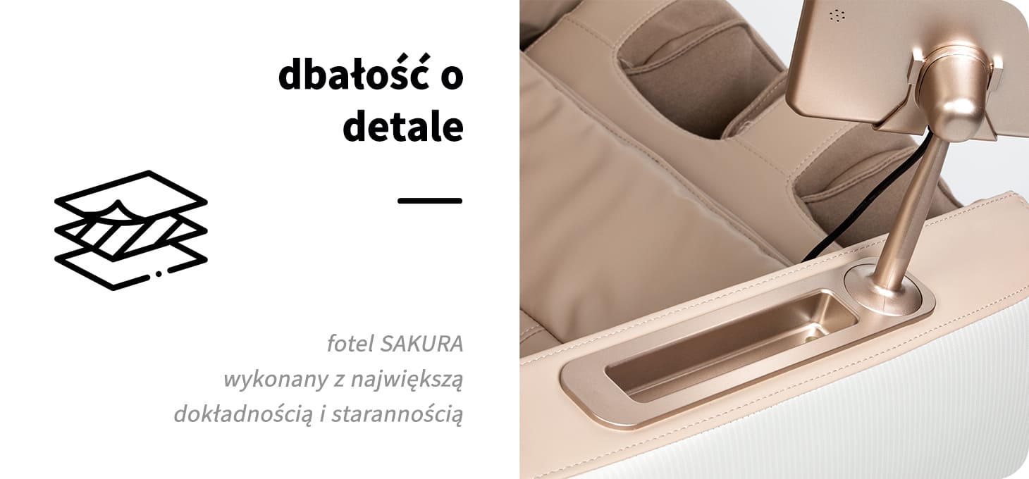 Fotele masujące Sakura zapewniają relaks oraz wysoki komfort użytkowania. Są również doskonałym sposobem, by zadbać o zdrowie oraz samopoczucie. Różnorodne funkcje oraz prostota obsługi sprawiają, że fotele tej marki są doskonałym wyborem zarówno do gabinetu masażu, jak i w użytku domowym. Wykonane z dbałością o szczegóły staną się estetycznym elementem każdej przestrzeni.