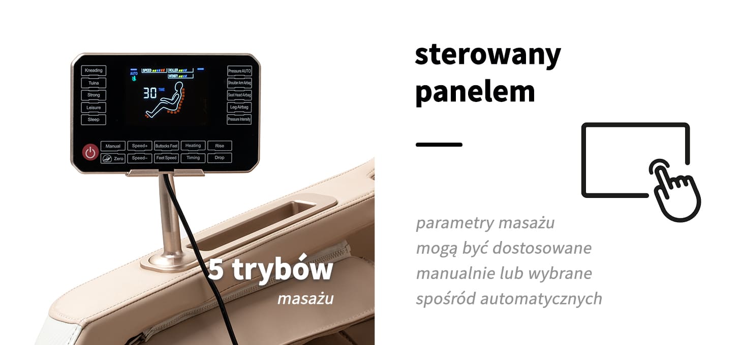 Czytelny ekran LCD i przejrzysty układ przycisków sprawiają, że obsługa fotela jest intuicyjna i wygodna. Panel można umieścić w uchwycie na prawym podłokietniku lub trzymać w dłoni, co zapewnia pełną swobodę sterowania. Na wyświetlaczu prezentowane są informacje o aktualnie masowanej partii ciała, intensywności masażu, czasie trwania sesji oraz wybranym programie. Użytkownik ma możliwość regulacji pozycji fotela, wyboru trybu masażu i ustawienia czasu trwania sesji: 15, 20, 25 lub 30 minut.