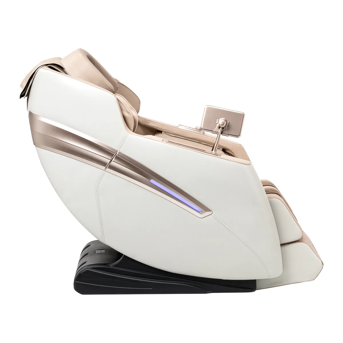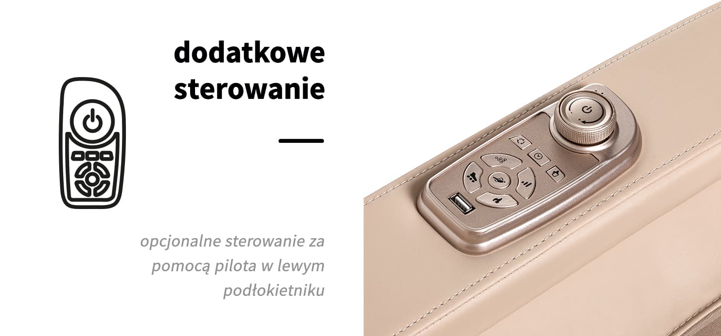 Dla jeszcze większej wygody użytkowania, fotel został wyposażony w zestaw przycisków sterujących wbudowanych w lewy podłokietnik. Podręczny pilot umożliwia szybki dostęp do najważniejszych funkcji bez konieczności sięgania po główny panel. Za jego pomocą można łatwo zmienić tryb masażu, uruchomić masaż stóp lub aktywować funkcję Zero Gravity – wszystko z myślą o maksymalnym komforcie i błogim relaksie. Ponadto wyposażony jest w port USB, co pozwala ładować telefon w trakcie masażu.