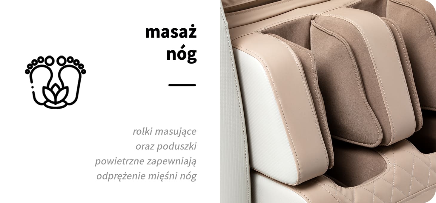 Zaawansowany mechanizm masujący skutecznie rozluźnia mięśnie, działając wielowymiarowo. Osiem głowic precyzyjnie masuje plecy, uda i pośladki, odwzorowując techniki manualnego masażu – ugniatanie i uciskanie – co sprzyja regeneracji, poprawia kondycję organizmu i pomaga redukować ból. Po każdej sesji odczuwalne jest wyraźne zmniejszenie napięcia mięśniowego, a ciało staje się zrelaksowane i odprężone. Dodatkowo, wbudowany masażer stóp wykorzystuje technikę akupresury, skutecznie rozluźnia zmęczone mięśnie, niweluje uczucie ciężkości i wspiera ogólne samopoczucie.