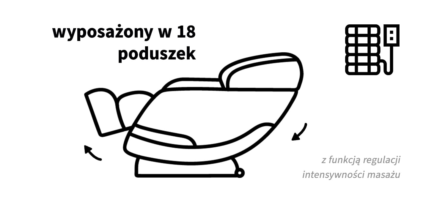Skutecznym uzupełnieniem masażu mechanicznego jest masaż uciskowy zapewniany przez 18 poduszek powietrznych rozmieszczonych w rejonie stóp, łydek, rąk, barków i głowy. Ich pulsacyjne działanie pobudza krążenie limfy, wspiera proces detoksykacji oraz poprawia przepływ krwi. Tego rodzaju masaż sprzyja dotlenieniu mięśni, obniżeniu ciśnienia i głębokiemu odprężeniu. Zakres oraz intensywność działania poduszek można dostosować indywidualnie za pomocą intuicyjnego panelu sterowania.