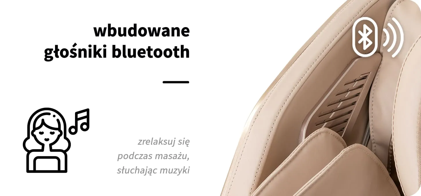 Dzięki wbudowanej funkcji Bluetooth możliwe jest połączenie fotela z urządzeniem mobilnym i odtwarzanie ulubionej muzyki podczas masażu. Spokojne dźwięki sprzyjają odprężeniu, poprawiają nastrój i pozwalają oderwać się od codziennych bodźców. Połączenie masażu z terapią dźwiękiem wspiera głębokie wyciszenie oraz regenerację ciała i umysłu.