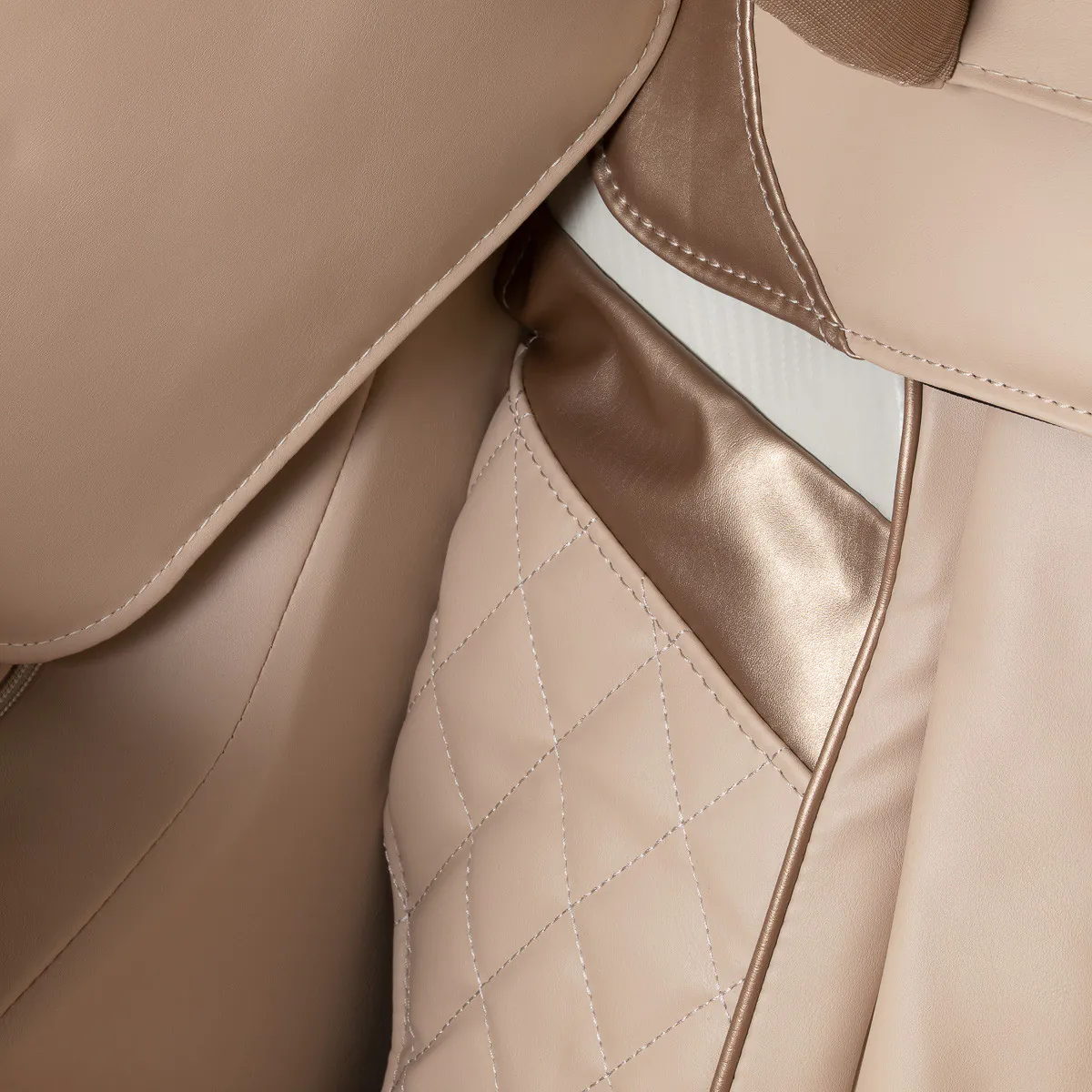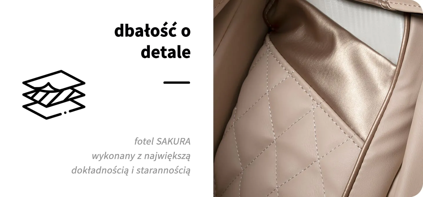 Miękka imitacja skóry w odcieniach beżu zapewnia wyjątkowy komfort użytkowania oraz łatwość w utrzymaniu czystości. Materiał ten jest nie tylko estetyczny, ale również odporny na wilgoć, co podnosi jego funkcjonalność. Zewnętrzne elementy w kolorze rose gold w połączeniu ze strukturalnym wykończeniem w tonacji bieli nadają fotelowi nowoczesny, stylowy wygląd. Kompaktowa forma oraz stonowana kolorystyka sprawiają, że model harmonijnie wpisuje się w różnorodne aranżacje wnętrz. Sakura Prime 108 to doskonały wybór dla osób poszukujących codziennego relaksu – zwłaszcza po intensywnym dniu lub wymagającym wysiłku fizycznym.