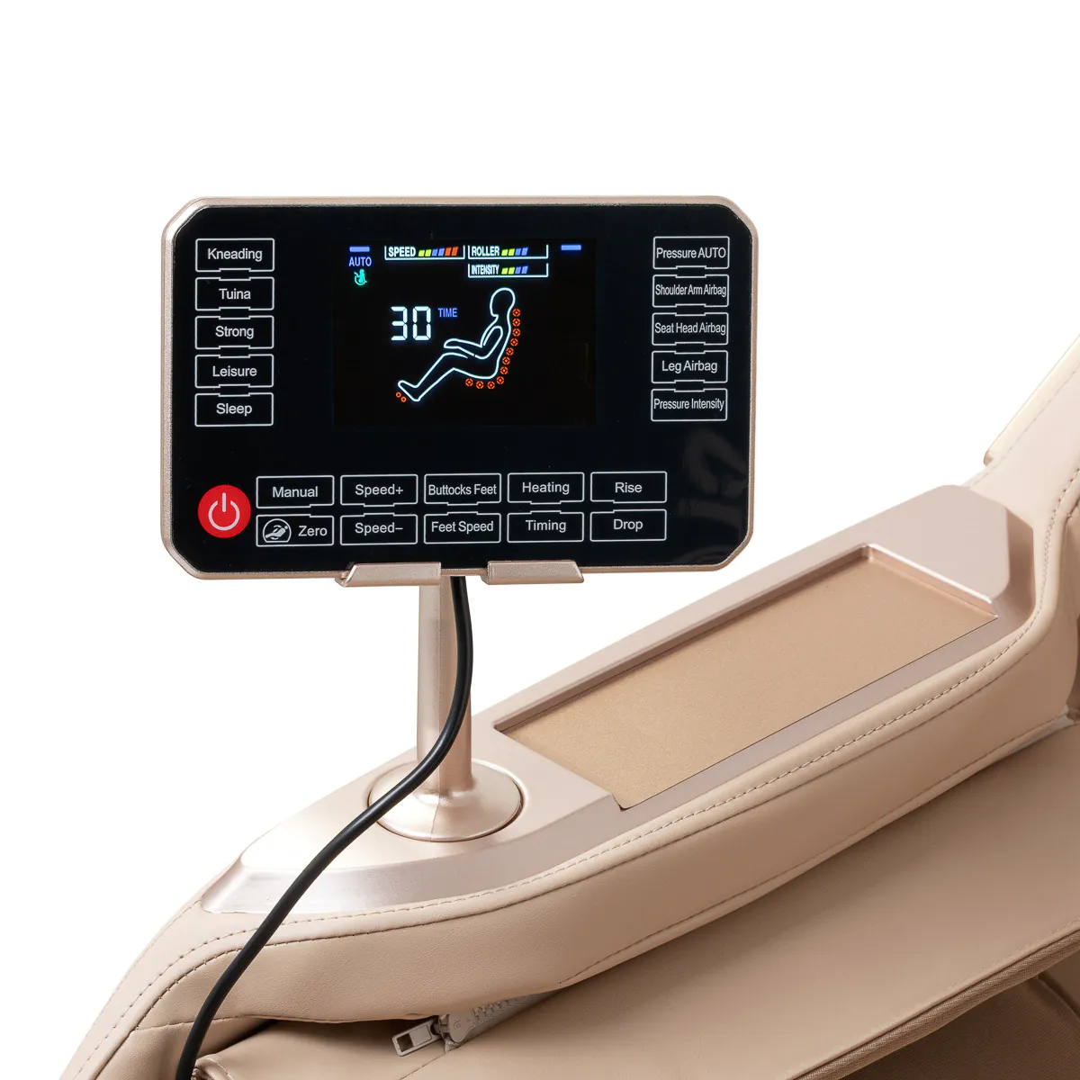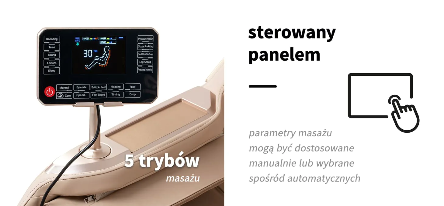 Przejrzysty panel sterowania z czytelnym ekranem LCD zapewnia intuicyjną obsługę fotela. Może być wygodnie umieszczony w uchwycie na prawym podłokietniku lub trzymany w dłoni. Na wyświetlaczu prezentowane są informacje o aktualnie masowanej partii ciała, intensywności masażu, czasie trwania sesji oraz wybranym programie. Za pomocą panelu można łatwo regulować pozycję fotela, wybrać preferowany tryb masażu oraz ustawić czas zabiegu – 15, 20, 25 lub 30 minut.