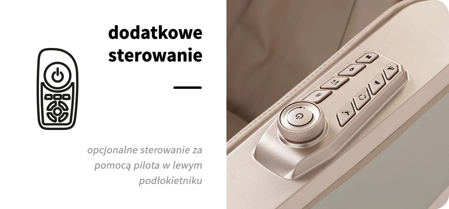 Dla jeszcze większej wygody fotel wyposażono w dodatkowy zestaw przycisków sterujących umieszczonych na lewym podłokietniku. Wbudowany podręczny pilot umożliwia szybki dostęp do najważniejszych funkcji bez konieczności sięgania po główny panel. Użytkownik może z łatwością zmieniać rodzaj masażu, uruchamiać masaż stóp oraz aktywować funkcję Zero Gravity – wszystko z myślą o maksymalnym komforcie i relaksie.