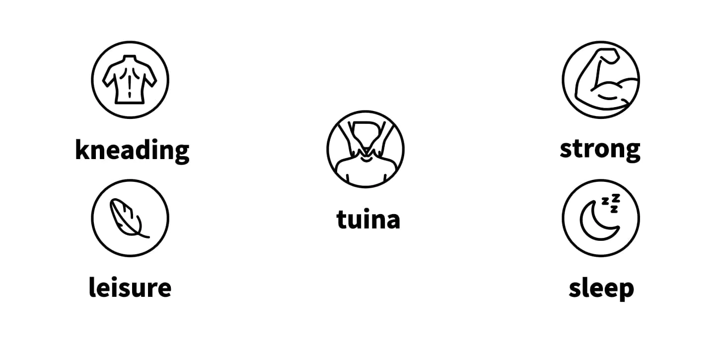 • Tuina (Tui Na) – Skoncentrowany na okolicy szyi i ramion masaż o średniej intensywności. Wspiera regenerację mięśni, poprawia krążenie i ułatwia zasypianie..