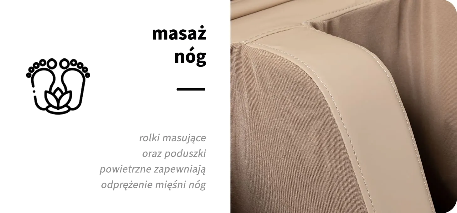 Zaawansowany mechanizm masujący skutecznie rozluźnia mięśnie, działając na kilka sposobów. Osiem głowic precyzyjnie masuje plecy, uda i pośladki, odwzorowując techniki manualnego masażu – ugniatania i uciskania. Taki zabieg poprawia kondycję całego organizmu, pomaga łagodzić bóle i niwelować napięcia mięśniowe. Po każdej sesji odczuwalne jest wyraźne zmniejszenie napięcia mięśniowego, a ciało staje się zrelaksowane i odprężone. Dodatkowo, wbudowany masażer stóp wykorzystuje akupresurę, skutecznie rozluźniając zmęczone mięśnie, eliminując uczucie ciężkości oraz wspierając ogólne samopoczucie.