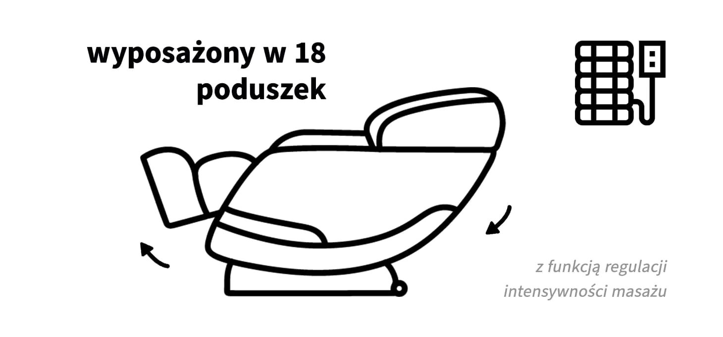 Skutecznym uzupełnieniem masażu mechanicznego jest masaż uciskowy zapewniany przez 18 poduszek powietrznych rozmieszczonych w rejonie stóp, łydek, rąk, barków i głowy. Ich rytmiczne działanie stymuluje krążenie limfy, wspiera proces detoksykacji oraz poprawia przepływ krwi. Tego rodzaju masaż sprzyja dotlenieniu mięśni, obniża ciśnienie i przyczynia się do głębokiego odprężenia. Zakres działania i intensywność poduszek można łatwo dostosować do własnych potrzeb za pomocą panelu sterowania.